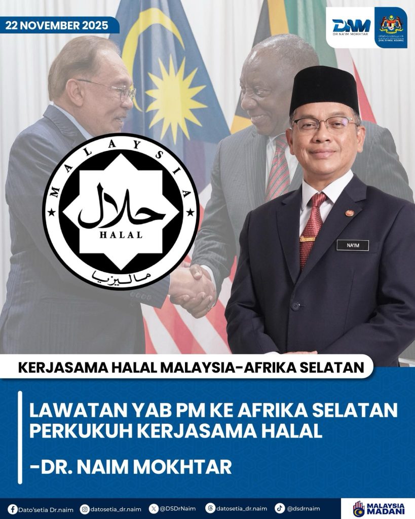 PUTRAJAYA, 23 Nov (IKIM) – Lawatan kerja Perdana Menteri, Datuk Seri Anwar Ibrahim ke Afrika Selatan dari 20 hingga 23 November 2025 dilihat bukan sahaja memperkukuh hubungan dua hala, tetapi turut membuka ruang kerjasama strategik baharu dalam memperluas jaringan halal global dan pembangunan ummah. Menteri di Jabatan Perdana Menteri (Hal Ehwal Agama) Dato’ Setia Dr. […]