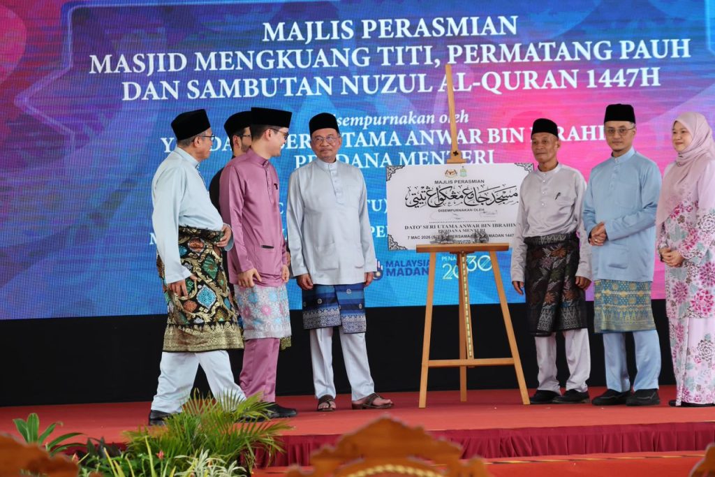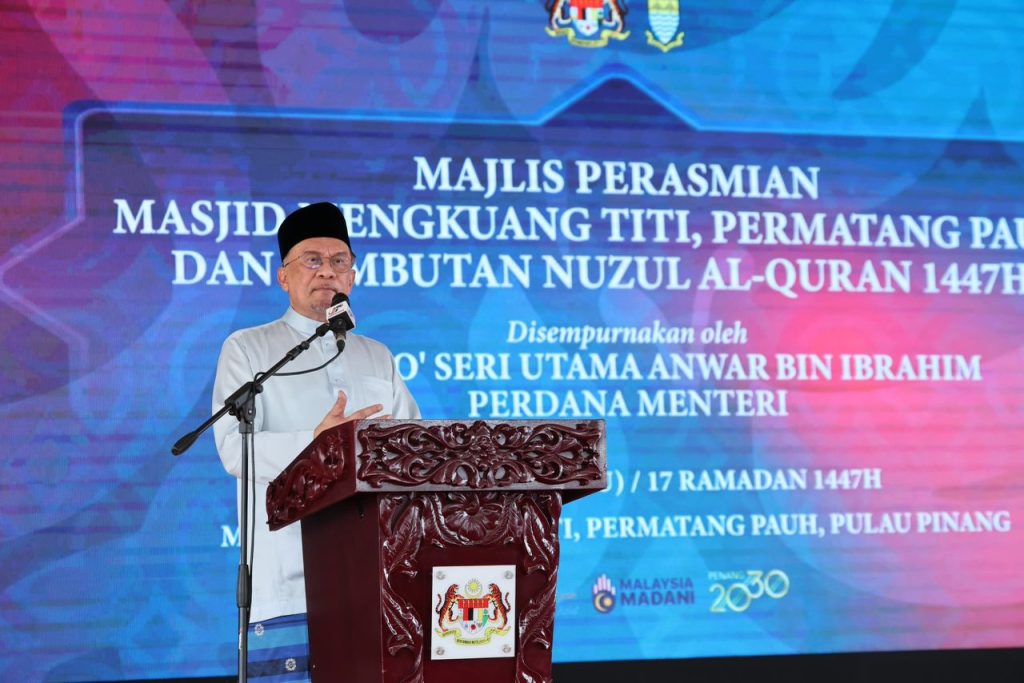PERMATANG PAUH, 7 Mac (IKIM) – Perdana Menteri, Anwar Ibrahim hari ini menyempurnakan Majlis Perasmian Masjid Jamek Mengkuang Titi bersempena sambutan Nuzul al-Quran 1447 Hijrah di Mengkuang Titi, Permatang Pauh, Pulau Pinang.