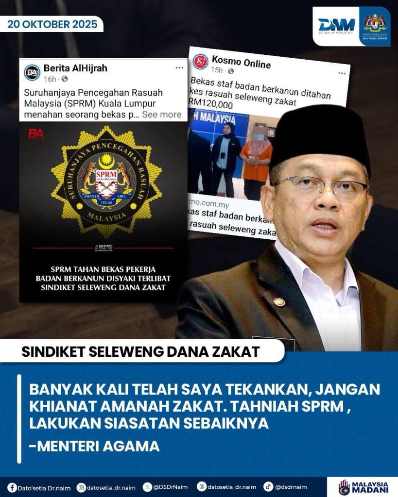 Menurut beliau lagi, teguran telah berulang kali diberikan kepada semua agensi di bawah portfolio Hal Ehwal Agama agar tidak mengkhianati amanah yang diberikan kerana kegagalan menjaga integriti bukan sahaja mencemar nama baik institusi, malah mengkhianati kepercayaan umat Islam.
